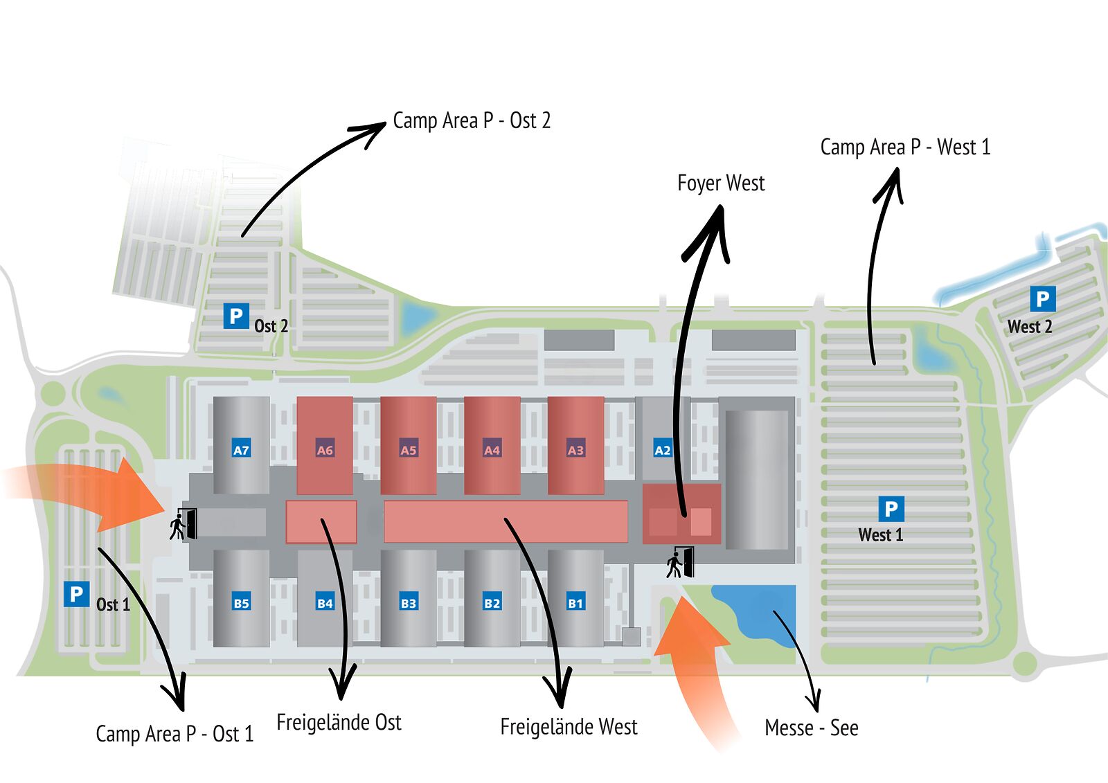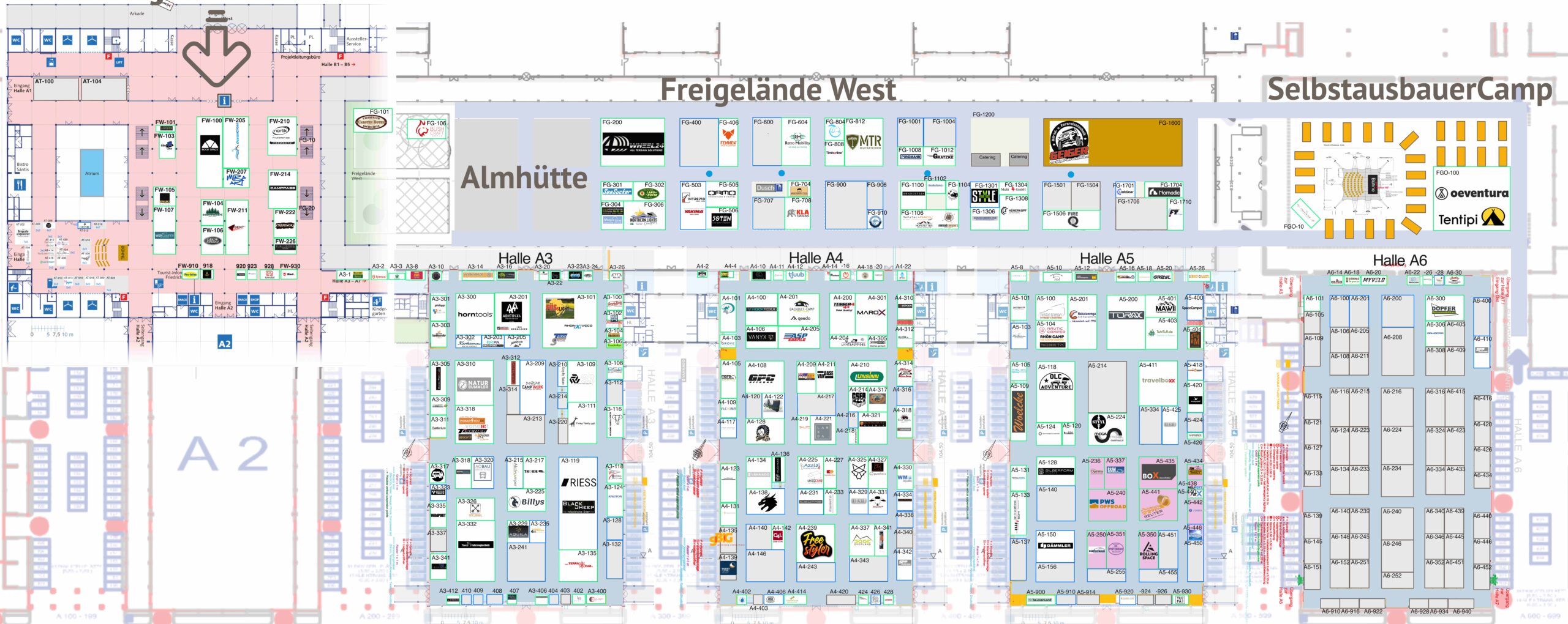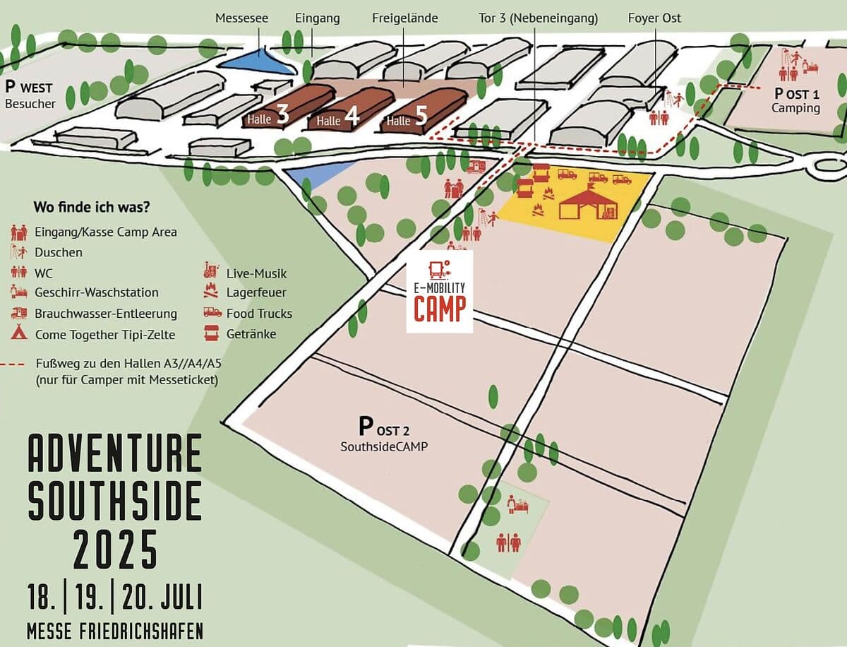 Die Adventure Southside belegt die Hallen A3, A4, A5, A6 und Foyer West sowie das Freigelände West und Ost. Der Eingang für Tagesbesucher ist der “Eingang West” gegenüber vom Messesee und die Camper kommen alle über den Osteingang auf das Messegelände.